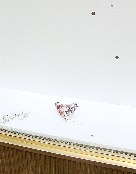 , Installation (Fotoarbeiten, Schrift, Fotoausschnitte hinter Scheibe montiert). Vitrine Paulin (Organisé par Cent lieux d'art), F. Solre le Chateau, Fr. Foto: M. Wittassek
