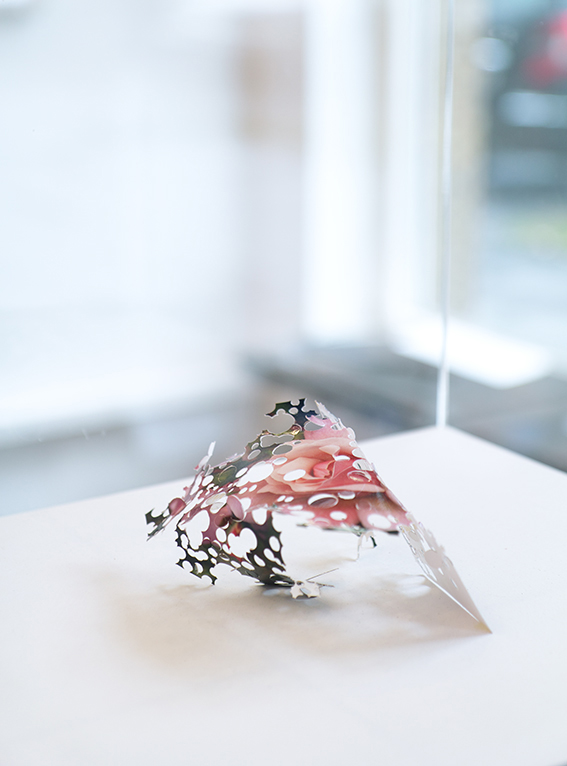 , 2005, Fotografie mit Ausstanzungen, 10 x 15 cm, Gesamtmaß mit Sockel u. Haube 138 x 30 x 35 cm